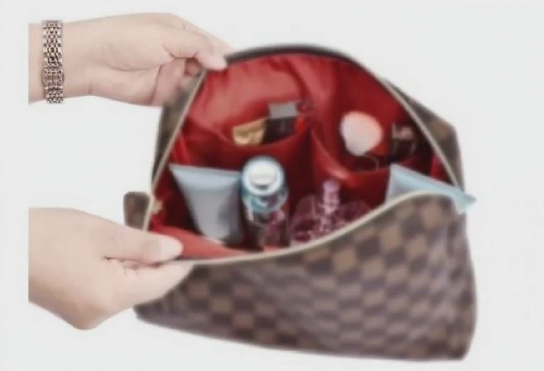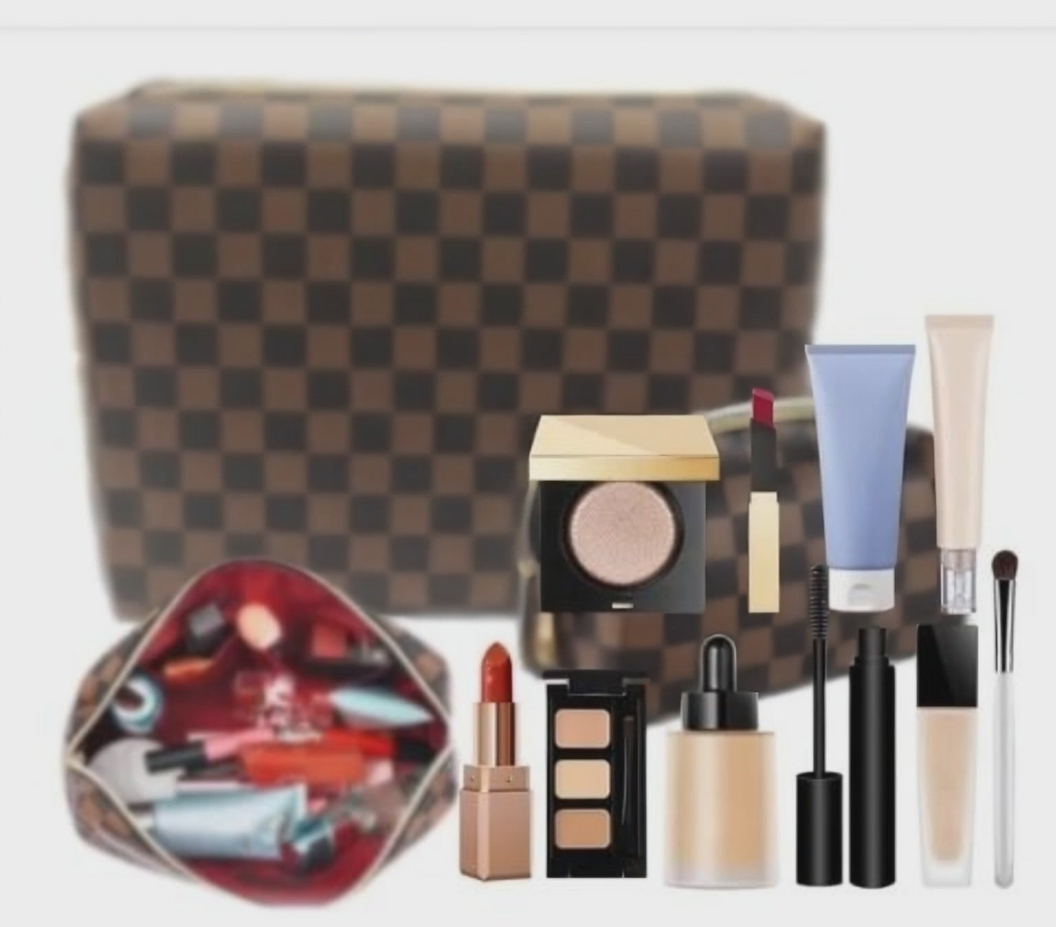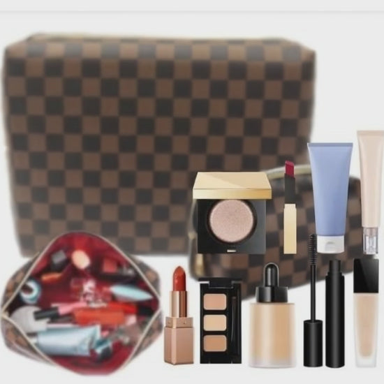 Checkered Makeup Bag; 2Pcs Travel Cosmetic Bags; Portable Toiletry Organizer for Women; Lightweight and Waterproof Leather Toiletries Bag for Girl Friend Wife Christmas Gifts; Brown